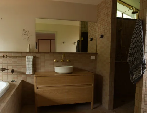 Our 'Rejuvenation of a Beach House' project in Merricks Beach began with a simple request to add a bathroom to the main bedroom, but we saw opportunities to improve external connections too. Garden views from the bathroom were considered important, as were stronger links between outdoor areas. Externally, the step down from the timber deck and the rear lawn was eliminated through use of a discrete retaining wall.